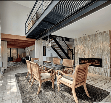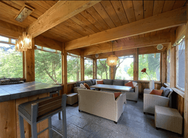 Fully screened space for entertaining or relaxing. Porting the architectural style of the main house to the outdoors. Kitchen with built-in high-end BBQ, fridge and industrial sink.